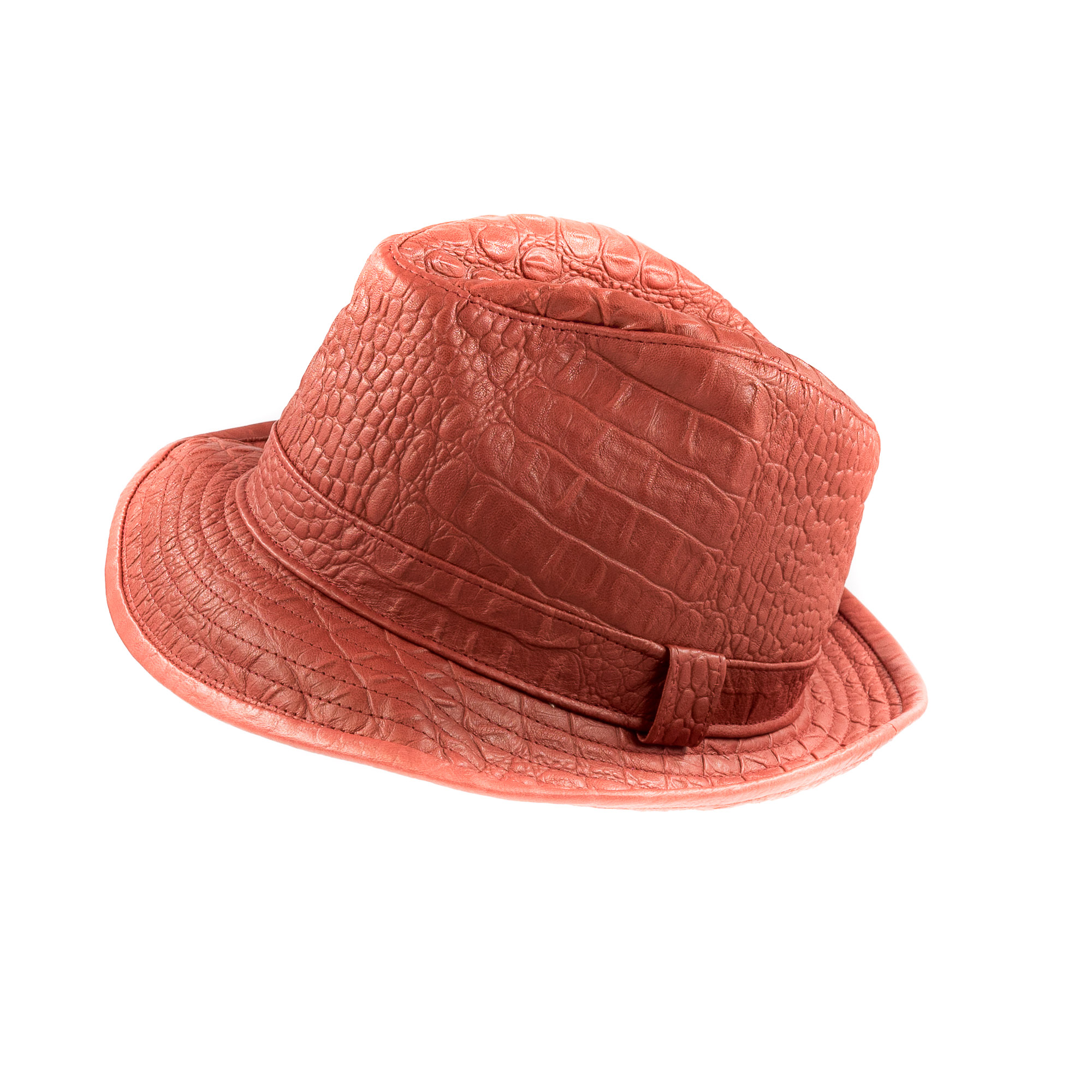 Cappello in pelle d’agnello pieno fiore stampato grana coccodrillo colore rosso. Questo cappello è comunamente conosciuto con il nome di Fedora, modello cult nella linea dei copricapi. Utilizzato dai divi di Hollywood, come Michael Jackson o dai Blues Brothers, il Fedora è un cappello top nella sua categoria. Ci sono degli accessori d’abbigliamento che non vengono mai dimenticati e il cappello stile Fedora, semplice ed elegante si è affermato come simbolo senza tempo. Il cappello Fedora è un accessorio di moda, pieno di fascino ed eleganza; dona un tocco chic e carismatico a chi lo indossa.